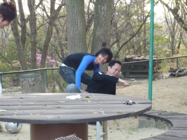社長と十倉くんがボールの取り合いをしています。