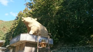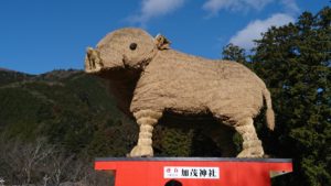 いつも名物の稲穂で作られた干支の巨大イノシシが